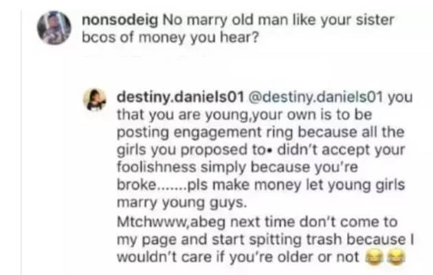 “you that you are young,your own is to be posting engagement ring because all the girls you proposed to didn’t accept your foolishness simply because you’re broke…….pls make money let young girls marry young guys. Mtchwww,abeg next time don’t come to my page and start spitting trash because I wouldn’t care if you’re older or not”