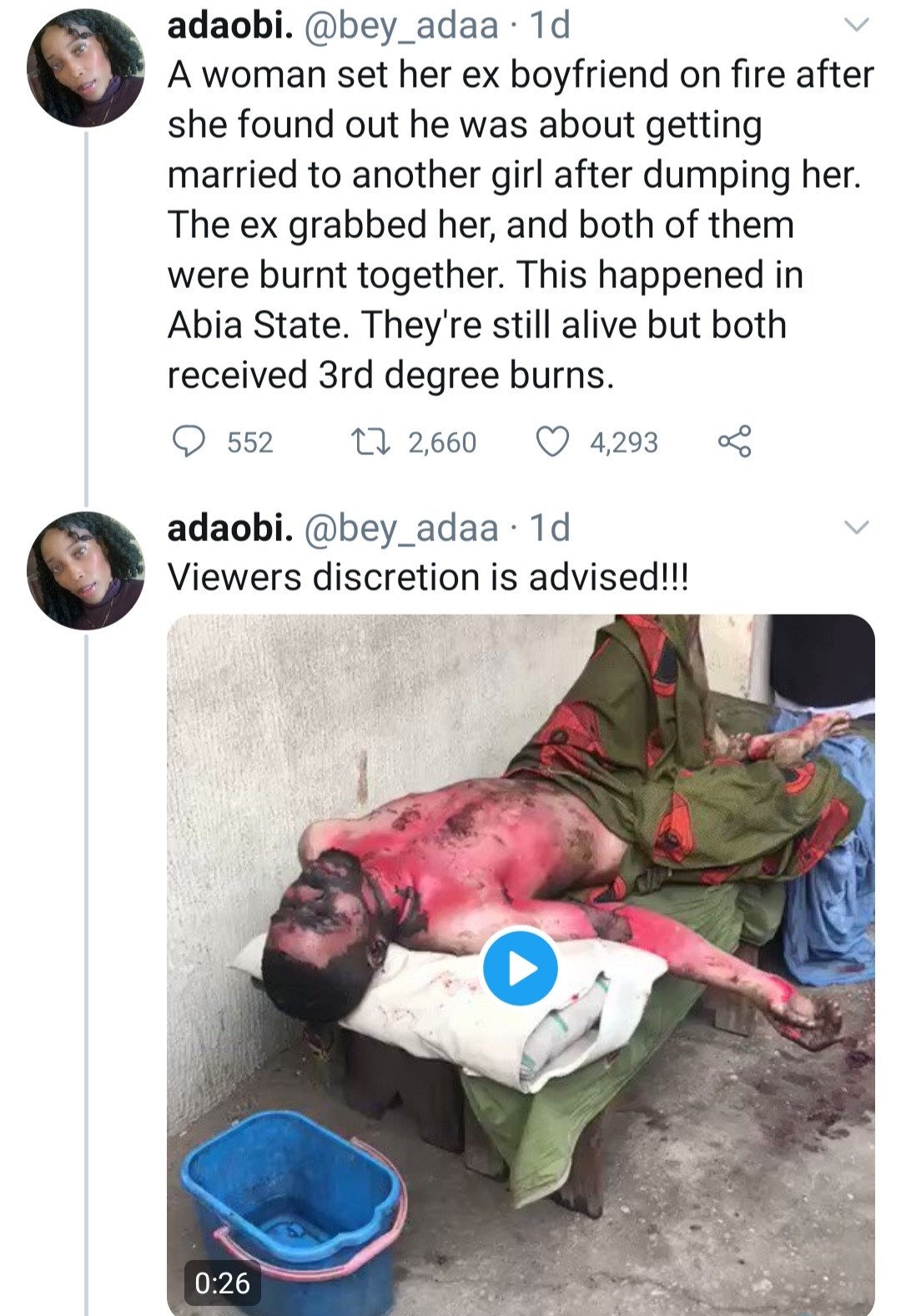 Woman sets her ex-boyfriend on fire in Abia state after discovering he was about marrying another woman after dumping her (Graphic photos/videos)